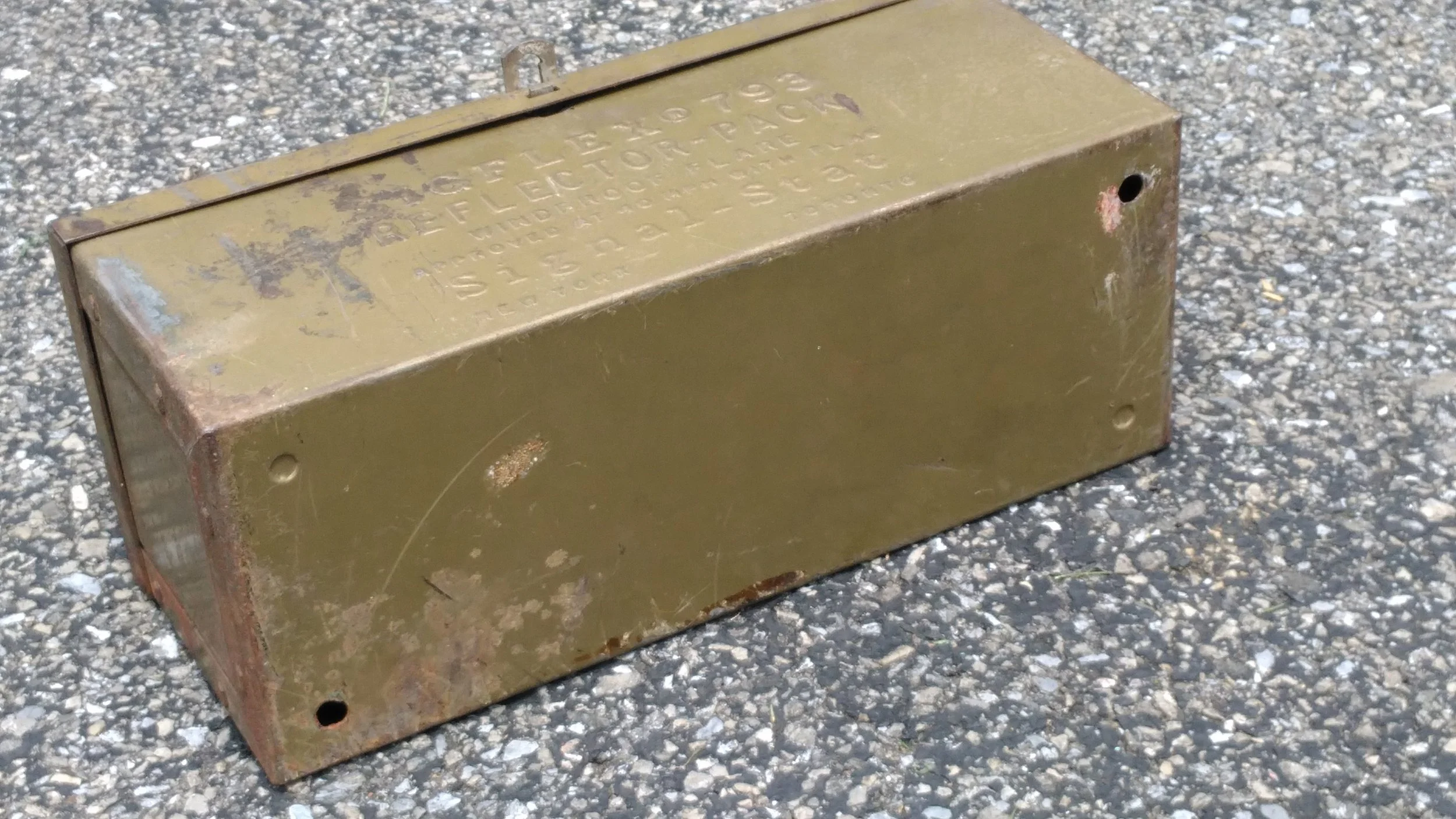 Circa 1950s. Good condition. A few dents. Slight rust. Original box with 3 glass flares. Readable instructions. Working. Cleaned. Sold as is. $30 each or all three for $75.